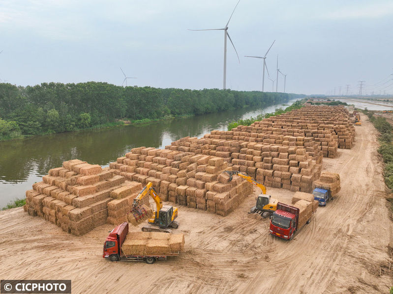 ↑2025年6月7日,在位于江苏省盐城市射阳县的江苏农垦新洋农场秸秆回收中心,农民驾驶机械整理回收的小麦秸秆。(无人机照片)CICPHOTO/张伟生 摄