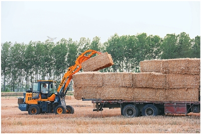 在江苏省连云港市海州区的江苏农垦岗埠农场,农民在田间打捆回收小麦秸秆,进行集中转运堆放。