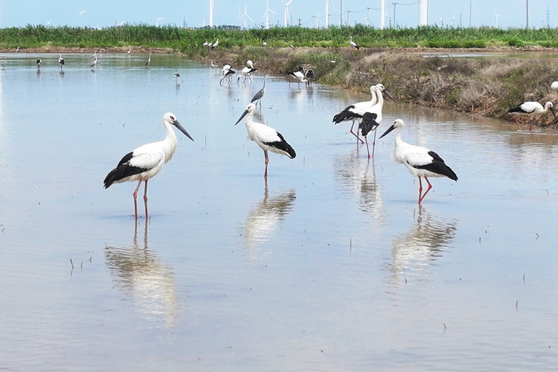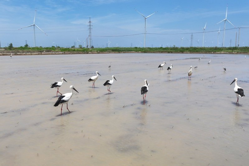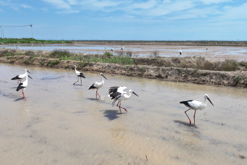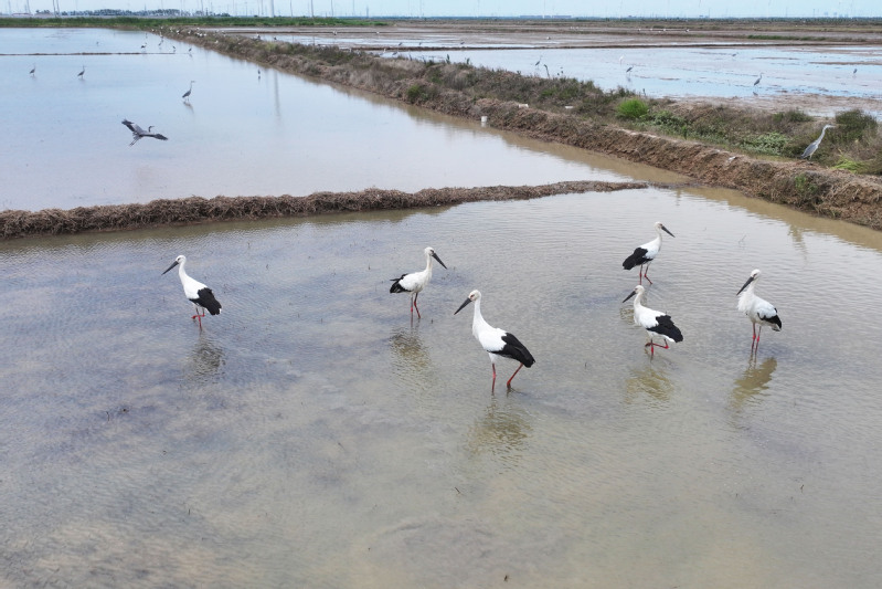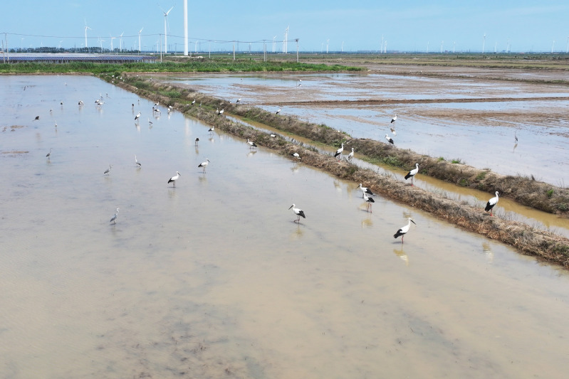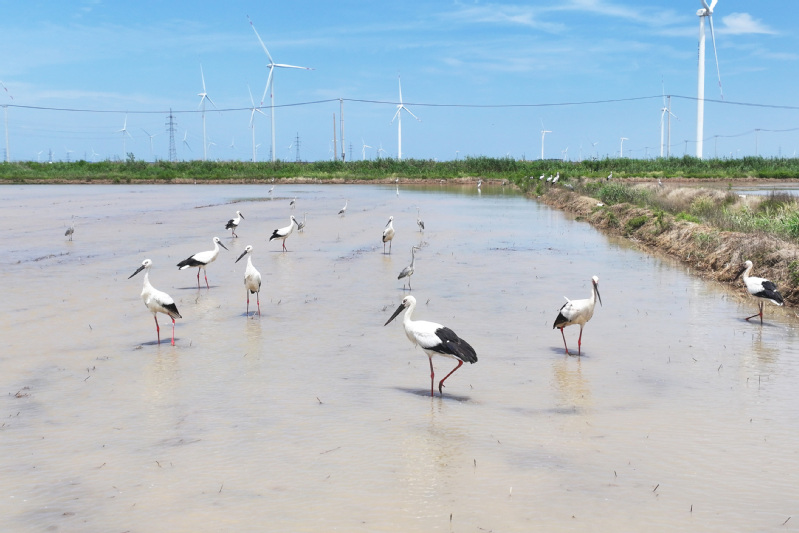 6月23日,江苏省盐城市射阳县临海农场顺泰生产区的水田里,50余只国家一级保护动物东方白鹳姿态优雅,正悠然漫步、觅食,与水田的碧波相互映衬,构成一幅灵动的生态画卷。