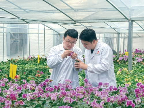 图为农场技术人员正在查看蝴蝶兰种苗。 受访者供图