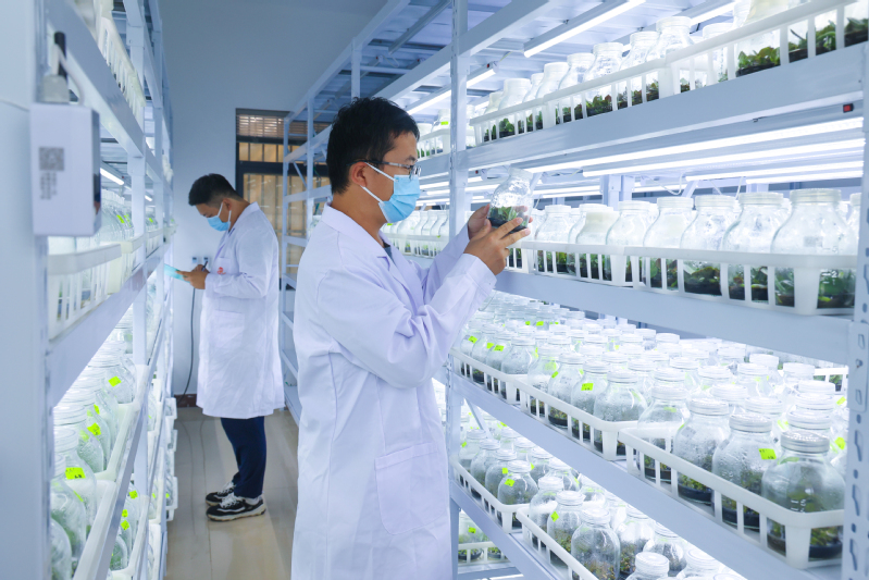 在江苏农垦云台农场的蝴蝶兰培养室里,培养架上排列着一瓶瓶嫩绿的幼苗。通过精准调控光照波长、湿度梯度和营养配方,不仅可以缩短蝴蝶兰育苗周期,还能显著提高苗子的成活率和抗病性。图为技术人员在开展日常蝴蝶兰幼苗培育观测工作,并同步系统记录生长数据及环境调控参数。
