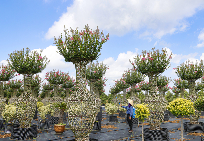 在新洋农场容器苗项目基地,工作人员冒着高温,穿梭在整齐排列的容器苗间,细致开展喷施营养液、修剪等苗圃管护作业,为苗木生长保驾护航。