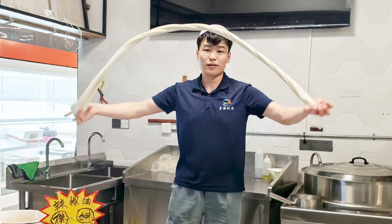 为支持青海拉面“四进”活动开展,中山精品酒店在1楼嘉年华超市单独开辟一处给青海河湟拉面产业运营有限公司制作销售拉面,实行0租金使用。图为工作人员在制作拉面场景。