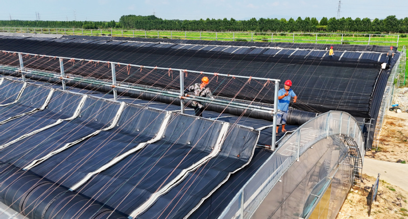 7月29日,连云港市海州区岗埠农场,工作人员正在检查、加固蔬菜大棚,防范台风“竹节草”。