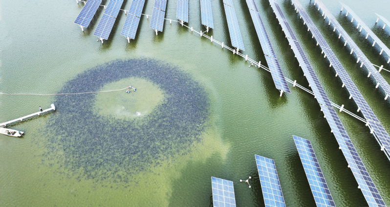 7月21日,俯瞰东辛农场光伏塘口,水面上成群的鱼争食,呈现“上有光伏发电,下有鱼虾欢腾”的生态生产图景。